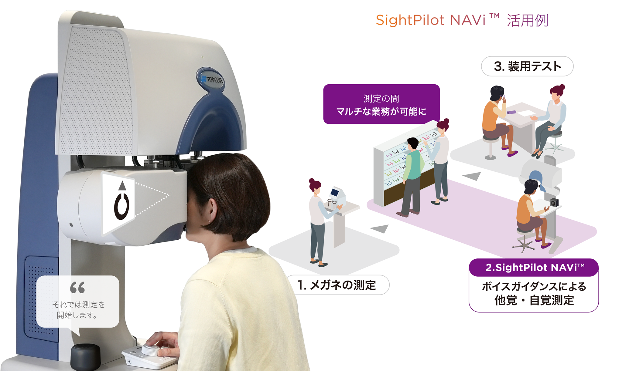 ボイスガイダンスに従いSightPilot NAVi コントローラーを使用して、測定をスムーズに進めることができます。他覚・自覚屈折測定を被検者が進めることができ、視力測定のワークフローの効率がアップします。ボイスガイダンスは多言語に対応していて、外国人の測定にも対応しています。被検者自身がダイヤルを操作して選んでから決定でき、納得感のある操作性を実現しています。視力測定から、加入度測定までシームレスに一連の測定フローを完了できます。