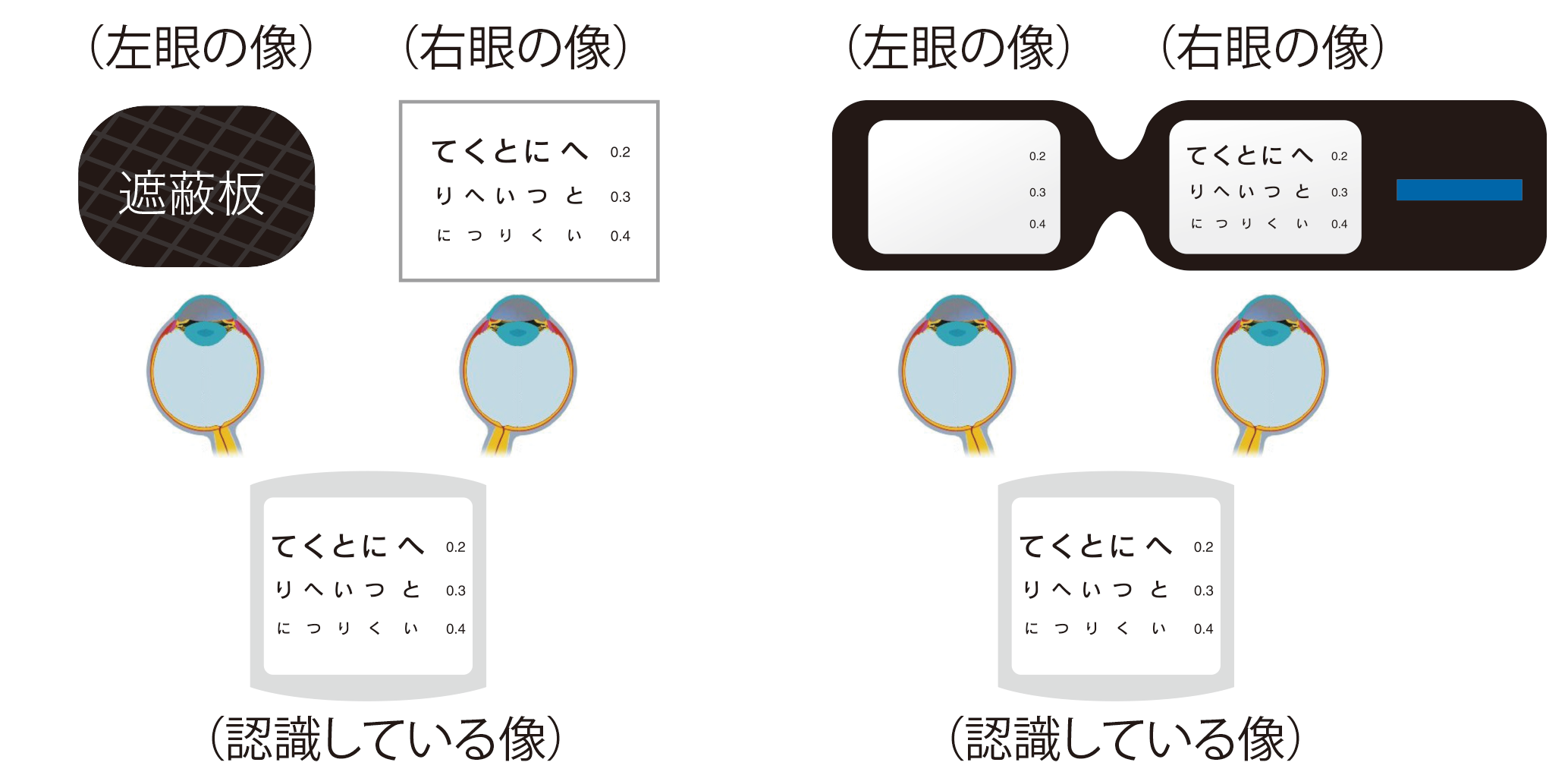 眼または左眼測定を行っている最中、遮蔽をせずに、両眼に円偏光フィルターをセットします。測定対象眼では視標は見えますが、測定対象眼と反対の眼では視標は見えません。両眼開放測定により、眼の調節の介入 (焦点を近くにあわせること)が低減されます。