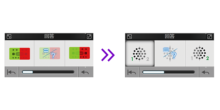 スマート測定コースを選択すると、画面に表示された3択の選択肢から被検者の回答に合わせて回答を選択することで、自動で測定が進みます。